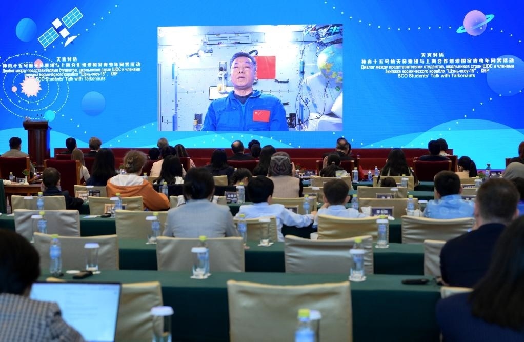 4月20日,神舟十五號航天員通過視頻屏幕回答上海合作組織國家青少年的提問。新華社記者 李賀 攝