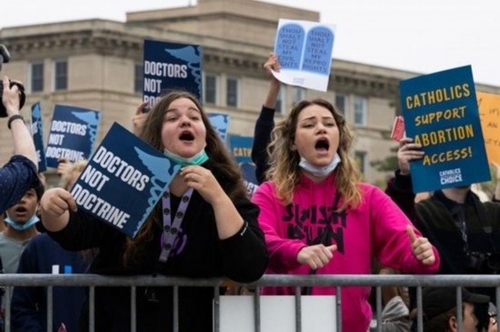 2022年5月3日,在美國華盛頓,支持和反對(duì)墮胎權(quán)的人們?cè)诿绹?lián)邦最高法院外集會(huì)。新華社發(fā)(亞倫攝)