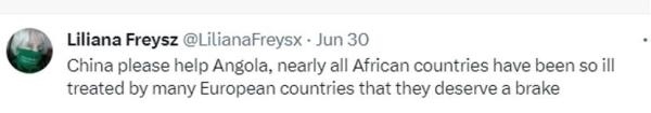 網(wǎng)友利利安娜·弗賴斯直呼:“中國請幫助安哥拉,幾乎所有非洲國家都忍受過歐洲國家的糟糕對待,它們該迎來轉(zhuǎn)機了?!?/p>