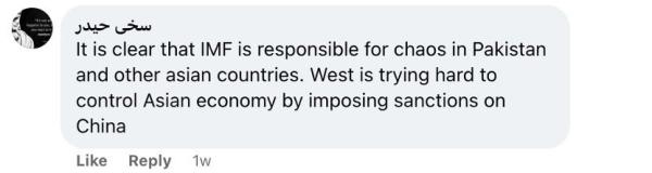 還有網(wǎng)友留言說:“國際貨幣基金組織對巴基斯坦和其他亞洲國家的混亂負有責(zé)任,這一點再清楚不過了。西方試圖通過制裁中國來控制亞洲經(jīng)濟。”