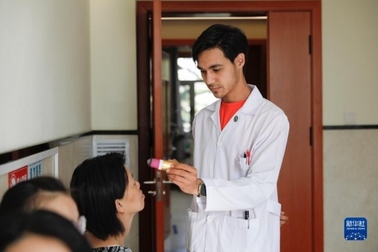 甘肅中醫(yī)藥大學(xué)針灸推拿專業(yè)的土庫曼斯坦留學(xué)生迪達(左)在臨床實習(xí)中為患者檢查眼睛(7月28日攝)。新華社記者 方欣 攝