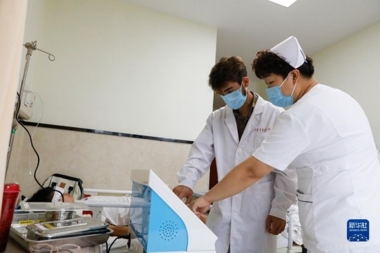 甘肅中醫(yī)藥大學(xué)針灸推拿專業(yè)的塔吉克斯坦留學(xué)生紀明哲(左)在老師的指導(dǎo)下學(xué)習(xí)直流電離子機器操作(7月27日攝)。新華社記者 陳斌 攝