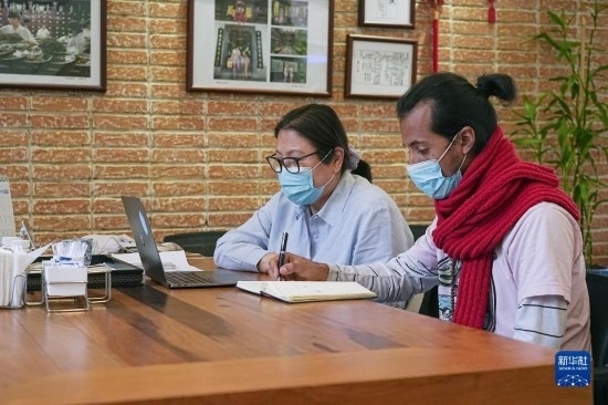 7月20日,在匈牙利布達佩斯匈牙利岐黃中醫(yī)藥中心,中心負責(zé)人陳震(右)和甘肅外派專家張海芳一同討論。新華社發(fā)(弗爾季·奧蒂洛攝)