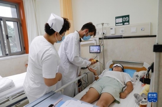 甘肅中醫(yī)藥大學(xué)針灸推拿專業(yè)的塔吉克斯坦留學(xué)生紀明哲(中)在臨床實習(xí)中為患者進行直流電離子導(dǎo)入操作(7月27日攝)。新華社記者 方欣 攝