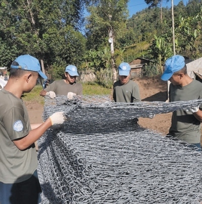 自去年9月部署到任務(wù)區(qū)以來,第二十六批維和工兵分隊(duì)已完成32項(xiàng)工程任務(wù)、26項(xiàng)工程勘察,累計修筑道路52公里、搭建板房50間、構(gòu)筑圍墻2100米。今年5月,南基伍省卡萊亥地區(qū)遭受強(qiáng)降雨和洪水災(zāi)害,造成400多人死亡,上千座民居被沖毀。關(guān)鍵運(yùn)輸線路上的魯濟(jì)拉橋被洪水沖垮,切斷了人道主義援助物資的運(yùn)輸線,給當(dāng)?shù)孛癖娊煌ǔ鲂泻涂购榫葹?zāi)造成嚴(yán)重影響。工兵分隊(duì)接到任務(wù)后,第一時間奔赴災(zāi)區(qū)一線,在河邊安營扎寨,執(zhí)行工程救援。7月,嶄新的魯濟(jì)拉橋已經(jīng)順利完工。