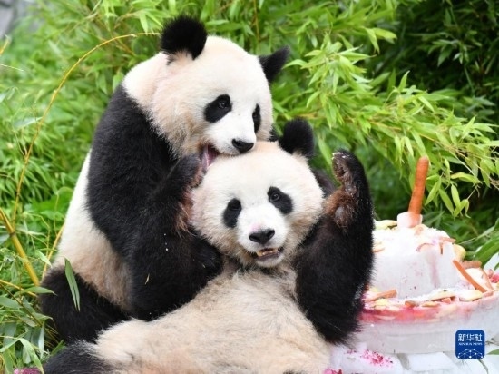 8月31日,大熊貓“夢想”(左)和“夢圓”在德國柏林動(dòng)物園享用“生日餐”。當(dāng)日,在德國出生的大熊貓雙胞胎兄弟“夢想”和“夢圓”迎來4歲生日,柏林動(dòng)物園為它們舉辦了慶祝活動(dòng)。新華社記者 任鵬飛 攝