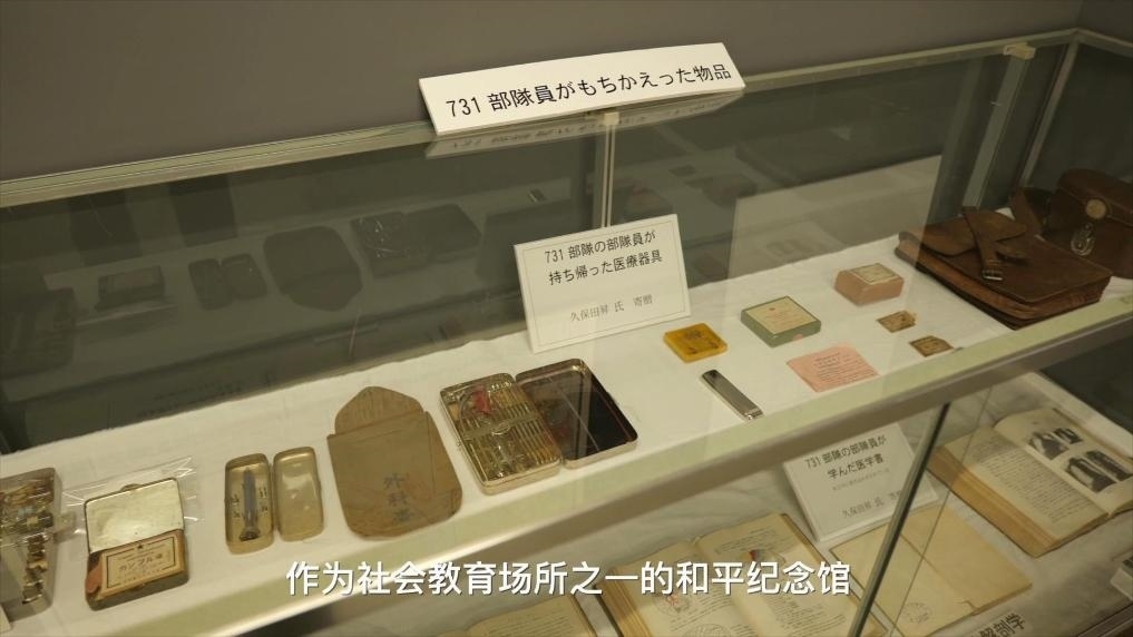 圖為飯?zhí)锸泻推狡砟铕^展廳內(nèi)展出的胡桃澤從731部隊(duì)帶回的手術(shù)器具等證物。(視頻截圖)
