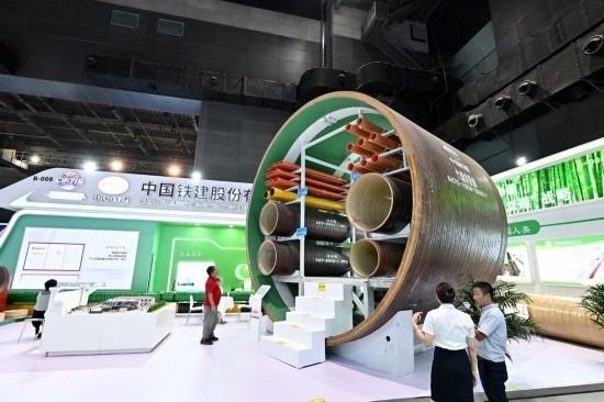 9月2日,在國家體育館舉行的服貿(mào)會環(huán)境服務專題展上,客商在中國鐵建展位竹纏繞管廊旁了解信息。新華社記者 李鑫 攝