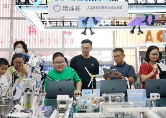 9月3日,在首鋼園教育服務專題展區(qū),小朋友在體驗智能硬件編程作品。新華社記者 張晨霖 攝