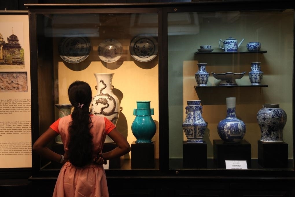 2014年9月15日,在斯里蘭卡首都科倫坡,游客參觀斯里蘭卡國家博物館展出的當?shù)爻鐾恋闹袊糯善?,一些中國外銷瓷器上還繪有南亞、伊斯蘭風情,與鄭和碑共同見證著古代海上絲綢之路和中斯友好交往的源遠流長。 新華社記者馮武勇攝