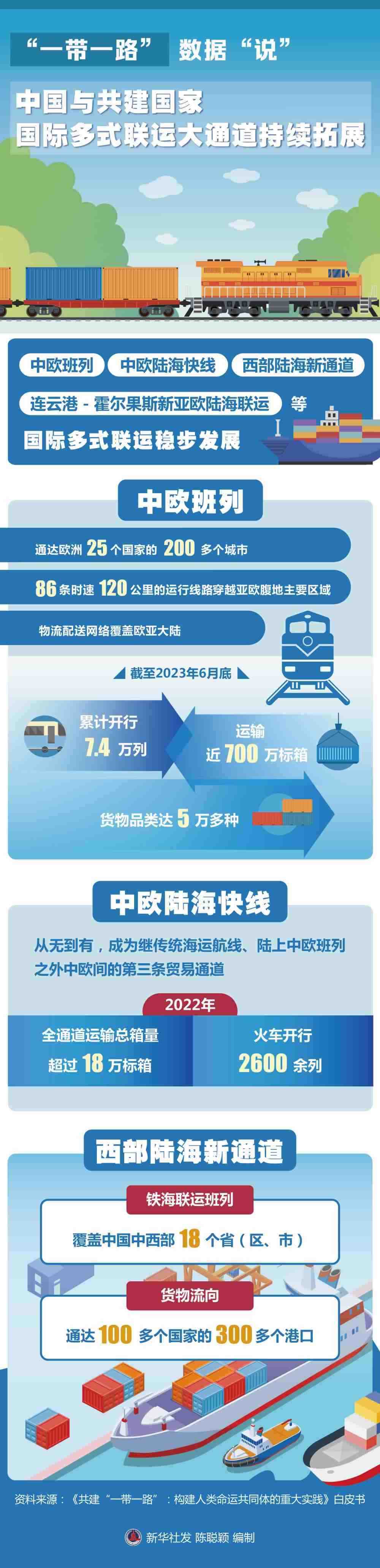國(guó)際多式聯(lián)運(yùn)大通道持續(xù)拓展。中歐班列、中歐陸??炀€(xiàn)、西部陸海新通道、連云港-霍爾果斯新亞歐陸海聯(lián)運(yùn)等國(guó)際多式聯(lián)運(yùn)穩(wěn)步發(fā)展。中歐班列通達(dá)歐洲25個(gè)國(guó)家的200多個(gè)城市,86條時(shí)速120公里的運(yùn)行線(xiàn)路穿越亞歐腹地主要區(qū)域,物流配送網(wǎng)絡(luò)覆蓋歐亞大陸;截至2023年6月底,中歐班列累計(jì)開(kāi)行7.4萬(wàn)列,運(yùn)輸近700萬(wàn)標(biāo)箱,貨物品類(lèi)達(dá)5萬(wàn)多種,涉及汽車(chē)整車(chē)、機(jī)械設(shè)備、電子產(chǎn)品等53大門(mén)類(lèi),合計(jì)貨值超3000億美元。中歐陸海快線(xiàn)從無(wú)到有,成為繼傳統(tǒng)海運(yùn)航線(xiàn)、陸上中歐班列之外中歐間的第三條貿(mào)易通道,2022年全通道運(yùn)輸總箱量超過(guò)18萬(wàn)標(biāo)箱,火車(chē)開(kāi)行2600余列。西部陸海新通道鐵海聯(lián)運(yùn)班列覆蓋中國(guó)中西部18個(gè)?。▍^(qū)、市),貨物流向通達(dá)100多個(gè)國(guó)家的300多個(gè)港口。
