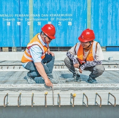 馬來西亞吉蘭丹州的馬東鐵項(xiàng)目一分部制梁場(chǎng),技術(shù)人員討論生產(chǎn)情況。新華社記者 朱 煒攝