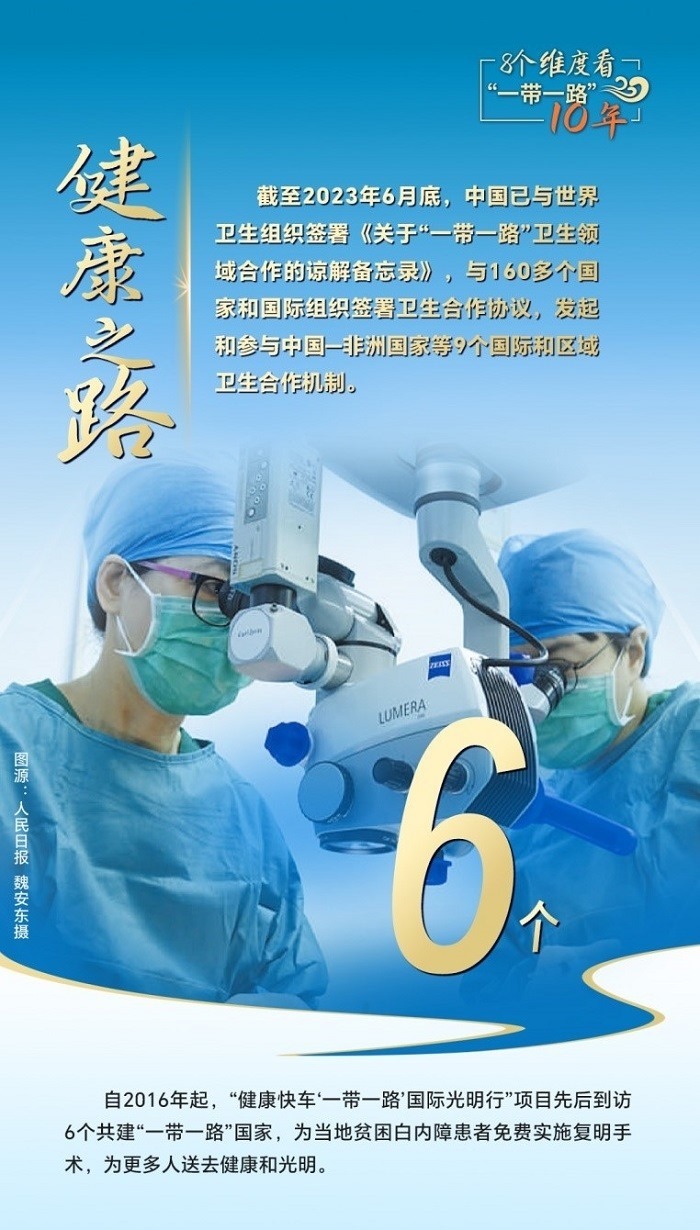 截至2023年6月底,中國已與世界衛(wèi)生組織簽署《關(guān)于“一帶一路”衛(wèi)生領(lǐng)域合作的諒解備忘錄》,與160多個國家和國際組織簽署衛(wèi)生合作協(xié)議,發(fā)起和參與中國—非洲國家、中國—阿拉伯國家、中國—東盟衛(wèi)生合作等9個國際和區(qū)域衛(wèi)生合作機制。為共建國家培養(yǎng)數(shù)萬名衛(wèi)生管理、公共衛(wèi)生、醫(yī)學科研等專業(yè)人才,向58個國家派出中國醫(yī)療隊,赴30多個國家開展“光明行”,免費治療白內(nèi)障患者近萬名,與湄公河流域國家、中亞國家、蒙古國等周邊國家開展跨境醫(yī)療合作,衛(wèi)生健康合作成效顯著。
