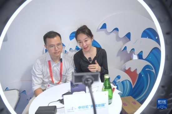工作人員在第二十三屆中國國際投資貿易洽談會中印尼“兩國雙園”展位開展直播活動(9月9日攝)。