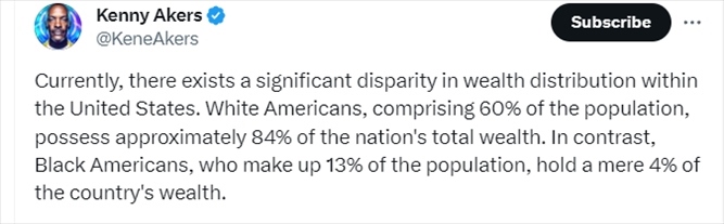 美國網(wǎng)友發(fā)文批評(píng)美國財(cái)富不平等現(xiàn)象表示,占據(jù)美國總?cè)丝?0%的白人擁有全美大約84%的財(cái)富,而占據(jù)人口13%的美國非裔卻只擁有4%。