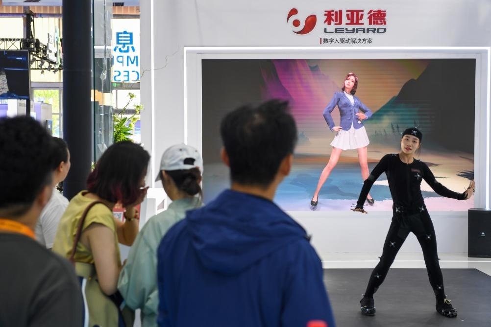 9月5日,在服貿(mào)會首鋼園區(qū)的電信、計(jì)算機(jī)和信息服務(wù)專題展內(nèi),參觀者觀看一家企業(yè)的數(shù)字人驅(qū)動解決方案演示。新華社記者 鞠煥宗 攝