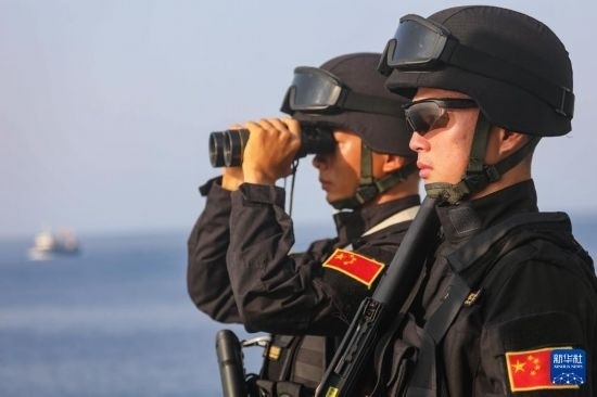 中國海軍第40批護(hù)航編隊岳陽艦特戰(zhàn)隊員在護(hù)航途中觀察警戒(2022年4月2日攝)。新華社發(fā)(唐文攝)