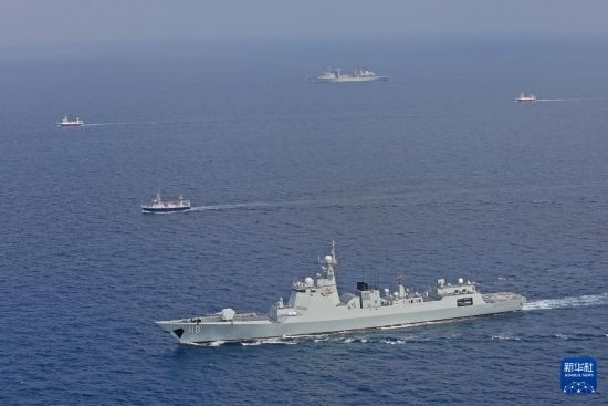 中國海軍第45批護(hù)航編隊烏魯木齊艦、東平湖艦為中國漁船護(hù)航(2023年10月20日攝)。新華社發(fā)(王遠(yuǎn)方攝)