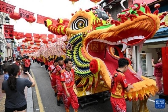 臨近春節(jié),馬來西亞馬六甲市雞場(chǎng)街上大紅燈籠高懸,一派喜慶景象。2月1日,由馬來西亞和中國的100多名青少年組成的舞龍隊(duì),共舞一條近200米的“長龍”在街道上穿行而過,蔚為壯觀,引人注目。