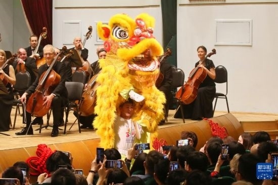 2月2日晚,2024“溫暖迎春·共慶中國年”白俄羅斯華僑華人新春交響音樂會(huì)在白俄羅斯明斯克的白俄羅斯國家音樂廳舉辦。這是音樂會(huì)上的中國傳統(tǒng)舞獅表演。新華社發(fā)(任科夫攝)