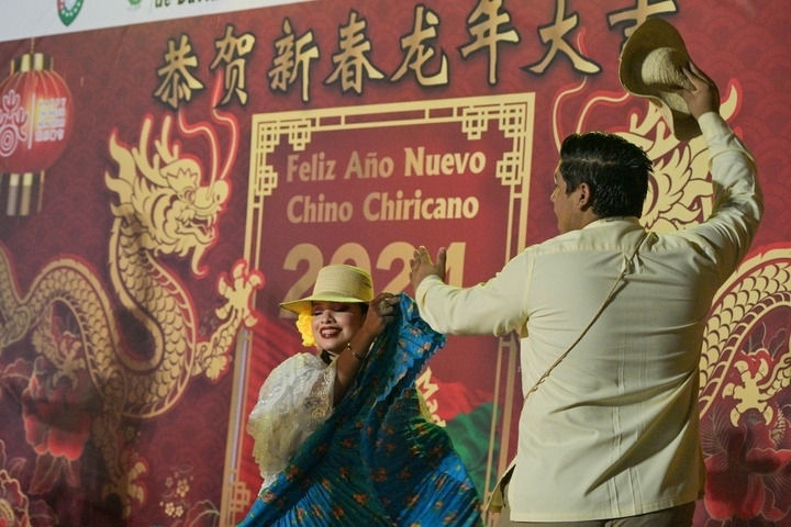 2月17日,在巴拿馬奇里基省首府戴維市,兩名身穿巴拿馬民族服飾的舞者在奇里基春節(jié)慶?;顒由媳硌?。新華社記者陳昊佺攝