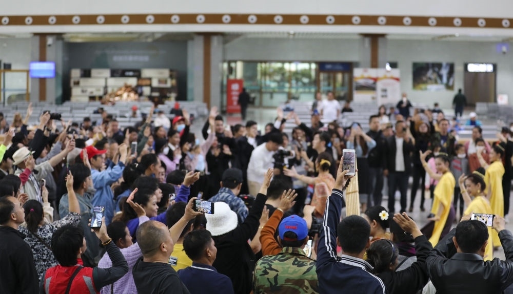 1月26日,旅客在中老鐵路萬象站候車廳候車時(shí)與表演者合影。