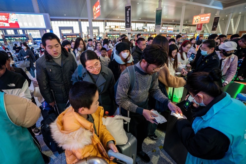 2月14日,乘坐中老鐵路國際旅客列車前往老撾的游客在昆明南站檢票進(jìn)站。