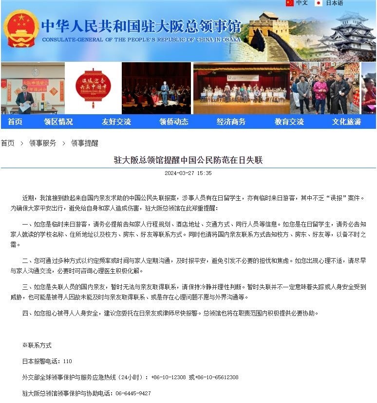 中國駐大阪總領(lǐng)館提醒中國公民防范在日失聯(lián)