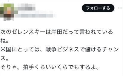 還有人說道:“有人說下一個澤連斯基是岸田。對美國來說,戰(zhàn)爭是賺錢的時機(jī),掌聲還是會給你的。”