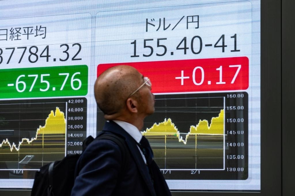 4月25日,行人走過日本東京一處顯示實時匯率的電子屏幕。新華社記者張笑宇攝