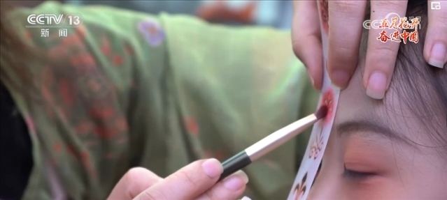 花鈿是古代女性在額頭部位點(diǎn)綴的一種花飾。現(xiàn)在的胡芯銀,不僅會(huì)根據(jù)顧客的年齡、臉型和服裝的樣式來搭配不同風(fēng)格的花鈿,還會(huì)給小姐姐們做一些傳統(tǒng)文化的講解。胡芯銀說,要想做得更好,就要多看多學(xué)。