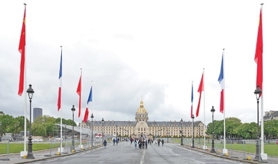 法國巴黎榮軍院前街道兩側(cè)懸掛中法兩國國旗。本報(bào)記者 王 遠(yuǎn)攝