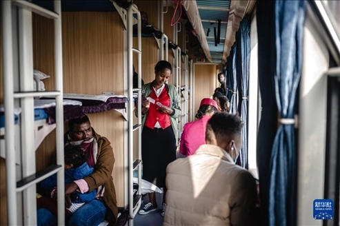2023年9月9日,列車員在亞吉鐵路列車的車廂內(nèi)查票。新華社記者 王冠森 攝