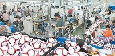 湖南省邵陽(yáng)市洞口縣工業(yè)園區(qū),金美達(dá)體育用品有限公司員工在生產(chǎn)足球,趕制出口訂單產(chǎn)品。滕治中攝(人民視覺)