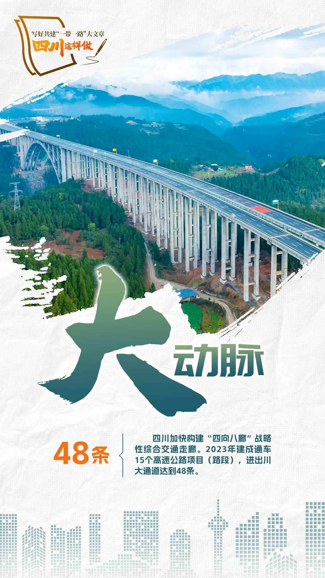 2023年,共建“一帶一路”走過第一個蓬勃十年,積極奔向更富活力的第二個“金色十年”。為推動共建“一帶一路”更高質(zhì)量、更高水平發(fā)展,宣布中國支持高質(zhì)量共建“一帶一路”的八項行動,包括構(gòu)建“一帶一路”立體互聯(lián)互通網(wǎng)絡、支持建設(shè)開放型世界經(jīng)濟、開展務實合作、促進綠色發(fā)展、推動科技創(chuàng)新、支持民間交往、建設(shè)廉潔之路、完善“一帶一路”國際合作機制。2024年,我們將目光聚焦四川,作為內(nèi)陸開放的前沿陣地、西部大開發(fā)的戰(zhàn)略依托,看看第二個十年,四川如何寫好高質(zhì)量共建“一帶一路”大文章。