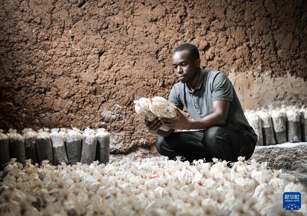 8月14日,在盧旺達南方省穆漢加區(qū),尼揚博·奧貝德在食用菌培育工坊內(nèi)檢查菌袋。曾兩次赴中國進行菌草技術培訓的尼揚博·奧貝德在南方省和東方省各擁有一家工坊。