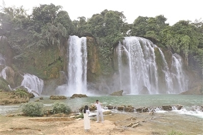 從越南首都河內(nèi)驅(qū)車往東北方向行駛400多公里,一路經(jīng)過(guò)星羅棋布的稻田,越過(guò)連綿不絕的原始叢林和崇山峻嶺,最終抵達(dá)高平省重慶縣潭水鄉(xiāng)歸春河畔,就能看到著名的中越德天(板約)跨國(guó)瀑布(見(jiàn)圖二,本報(bào)記者楊曄攝)。10月14日,中越德天(板約)瀑布跨境旅游合作區(qū)宣布正式投入運(yùn)營(yíng),成為中國(guó)首個(gè)跨境旅游合作區(qū)。近日,本報(bào)記者到此進(jìn)行了實(shí)地探訪。