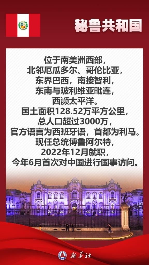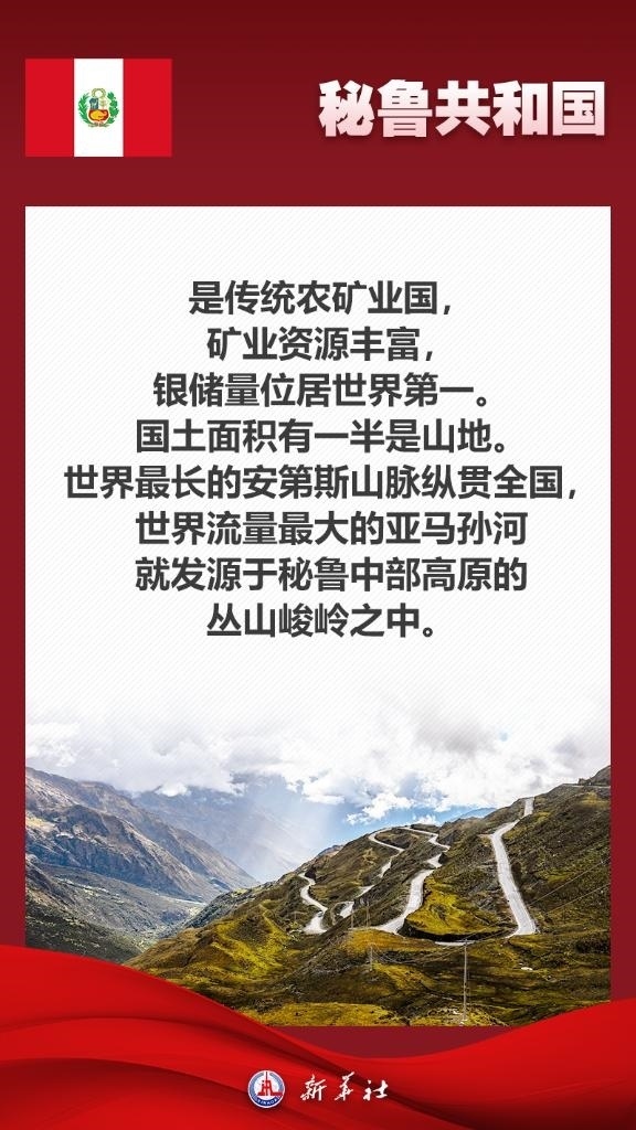 應(yīng)秘魯共和國總統(tǒng)博魯阿爾特邀請,國家主席習(xí)近平將于11月13日至17日赴利馬出席亞太經(jīng)合組織第三十一次領(lǐng)導(dǎo)人非正式會(huì)議并對秘魯進(jìn)行國事訪問。秘魯位于南美洲西部,是印加文明發(fā)祥地,也是最早同新中國建交的拉美國家之一。關(guān)于秘魯,七張海報(bào)帶你了解更多——