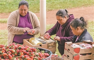 中國(guó)三峽巴西公司在位于巴西南部格利保吉水電站周邊開展創(chuàng)收創(chuàng)業(yè)試點(diǎn)項(xiàng)目。圖為當(dāng)?shù)剞r(nóng)戶正在分裝草莓。納塔利婭·弗洛爾攝
