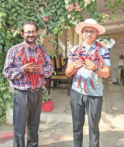 參與中國(guó)—巴基斯坦辣椒種植合作項(xiàng)目的中國(guó)專家與當(dāng)?shù)丶夹g(shù)員共同慶祝辣椒豐收。本報(bào)巴基斯坦分社 瓦卡斯·阿赫邁德攝