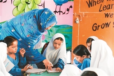 走進(jìn)干凈整潔的校園,讀書聲、嬉戲聲聲聲入耳,孩童的活力、青春氣息撲面而來(lái)。在八年級(jí)的課室里,戴著一條寫有“文學(xué)比賽冠軍”紅綬帶的女學(xué)生薩伊巴·阿斯加爾·阿里成功搶到了回答問(wèn)題的機(jī)會(huì),正在大聲地在全班面前朗誦英語(yǔ)課文。薩伊巴告訴記者,她有7個(gè)姐妹,如果沒有這所學(xué)校,她可能就沒學(xué)上了。