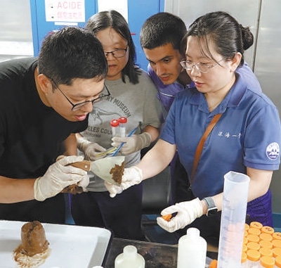 中外科學(xué)家在“深海一號(hào)”船上實(shí)驗(yàn)室內(nèi)處理微生物樣品。