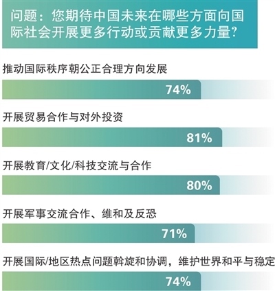 近七成國(guó)外受訪民眾期待中國(guó)未來更多參與國(guó)際事務(wù)或發(fā)揮更大作用。近九成支持中國(guó)在有關(guān)國(guó)際機(jī)構(gòu)、機(jī)制或平臺(tái)中發(fā)揮更大作用。八成多期待中國(guó)在經(jīng)貿(mào)合作與教科文兩個(gè)領(lǐng)域作出更多國(guó)際貢獻(xiàn);七成多期待中國(guó)在國(guó)際秩序建設(shè)、維護(hù)和平穩(wěn)定方面發(fā)揮更大作用。國(guó)外受訪民眾對(duì)“構(gòu)建人類命運(yùn)共同體”的認(rèn)知率達(dá)66%,對(duì)三大全球倡議和共建“一帶一路”倡議的認(rèn)知率為七成左右。對(duì)“平等有序的世界多極化”和“普惠包容的經(jīng)濟(jì)全球化”兩項(xiàng)主張,國(guó)外受訪民眾有超過半數(shù)認(rèn)同。