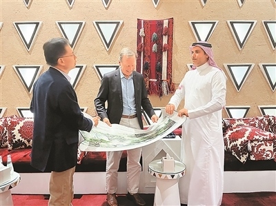 尼爾·布什(中)與Skytower Investments首席執(zhí)行官方洪(左),向沙特阿拉伯國家工業(yè)發(fā)展與物流計(jì)劃署首席執(zhí)行官蘇萊曼·本·哈立德·馬茲魯阿(右)贈(zèng)送中國絲綢畫卷。