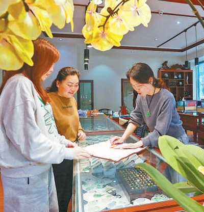 出生在緬甸的余鴻仙(右一)向客人介紹翡翠。