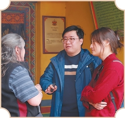 記者在敏珠林寺采訪澳大利亞游客亨麗埃塔·曼寧(左一)。