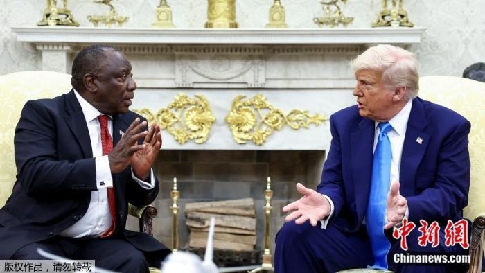 2025年5月21日,美國(guó)總統(tǒng)特朗普在白宮橢圓形辦公室會(huì)見(jiàn)南非總統(tǒng)拉馬福薩。