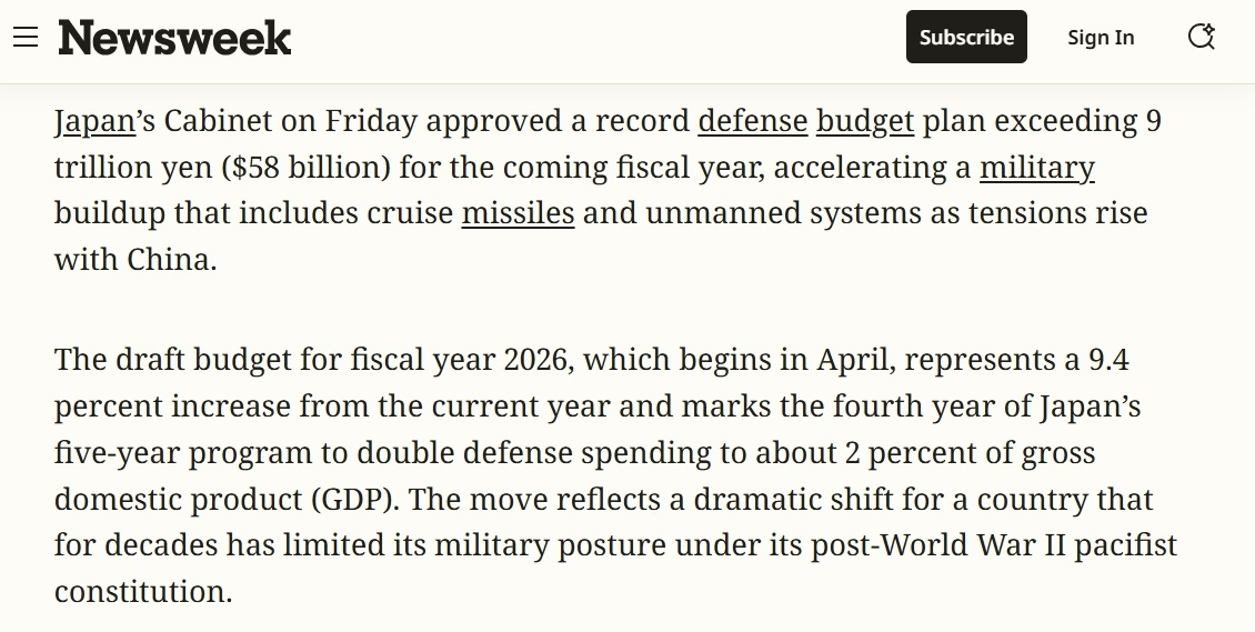 美國(guó)《新聞周刊》的報(bào)道稱(chēng),日本2026財(cái)年防衛(wèi)預(yù)算比今年增加了9.4%。新預(yù)算的一個(gè)重點(diǎn)是加強(qiáng)日本“遠(yuǎn)距離打擊敵方目標(biāo)的能力”,這大大偏離了日本長(zhǎng)期以來(lái)嚴(yán)格限制使用武力用于自衛(wèi)的原則。
