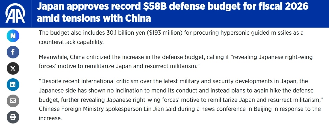 日本政府12月26日批準(zhǔn)2026財(cái)年(2026年4月至2027年3月)預(yù)算案,其中防衛(wèi)預(yù)算超9萬(wàn)億日元,再創(chuàng)歷史新高。其展現(xiàn)出的日本負(fù)面軍事動(dòng)向,受到國(guó)際媒體關(guān)注。
