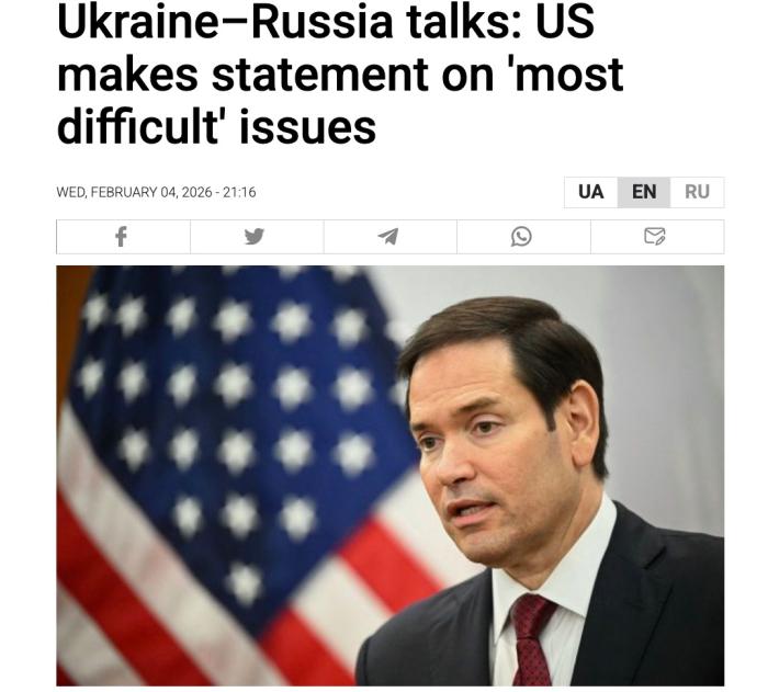 中新網(wǎng)2月5日電 綜合RBC-烏克蘭通訊社等外媒報(bào)道,由俄羅斯、美國、烏克蘭三國代表組成的安全問題工作組4日在阿聯(lián)酋首都阿布扎比舉行新一輪會(huì)談。美國國務(wù)卿魯比奧表示,會(huì)談已取得一定進(jìn)展,但最棘手問題仍未解決。
